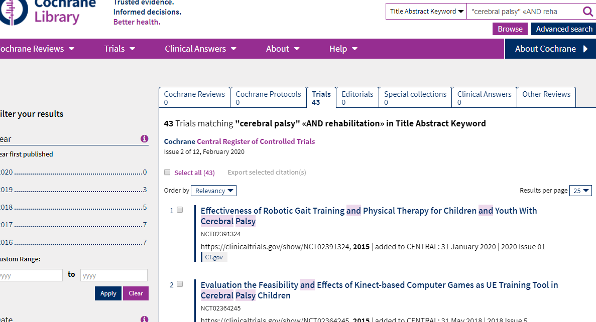 Det kan være vanskelig å få gode, relevante treff. Her finner du noen eksempler på hvordan du kan finne fram i Cochrane Library.