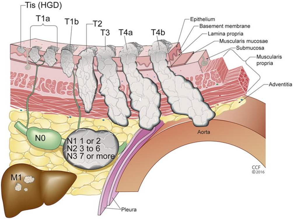 - Høygradig dysplasi og kreft som affiserer mukosa (T1a) og det øverste laget av submukosa i øsofagus klassifiseres som kreft i tidlig stadium