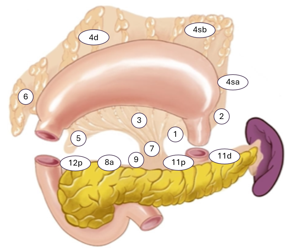 N-staging: CT har lavere sensitivitet enn EUS for å avdekke patologiske lymfeknuter regionalt (Nie et al., 2017). Noen lymfeknutestasjoner er imidlertid utilgjengelige for EUS, slik at modalitetene utfyller hverandre. Sensitivitet for patologiske lymfeknuter ved CT er rapportert mellom 62,5%-91,9% (Kwee et al., 2007). Det er ikke etablert konsensus om hva som definerer en patologisk lymfeknute og praksis vil nok variere fra sykehus til sykehus. Men følgende karakteristika er ofte sett når man undersøker CT-bilder opp mot biopsimateriale (Kwee et al., 2007);