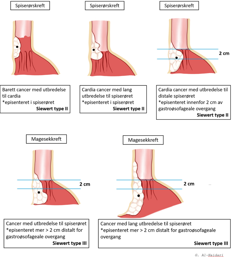 - Øsofagus. Tumors eksakte beliggenhet målt i cm fra tannrekken og fra den gastroøsofageale overgangen («top of gastric fold», GØ-overgang), samt sirkulær utbredelse, må angis. Ved hernie angis diafragmakanten. Siewerts klassifisering bør her benyttes, se bilde i kirurgikapittelet. Ved Barretts øsofagus angis øvre og nedre begrensning etter Praha-klassifikasjonen (CM klassifisering). Endoskopisk overvåkning av Barret slimhinne skal fotodokumenteres