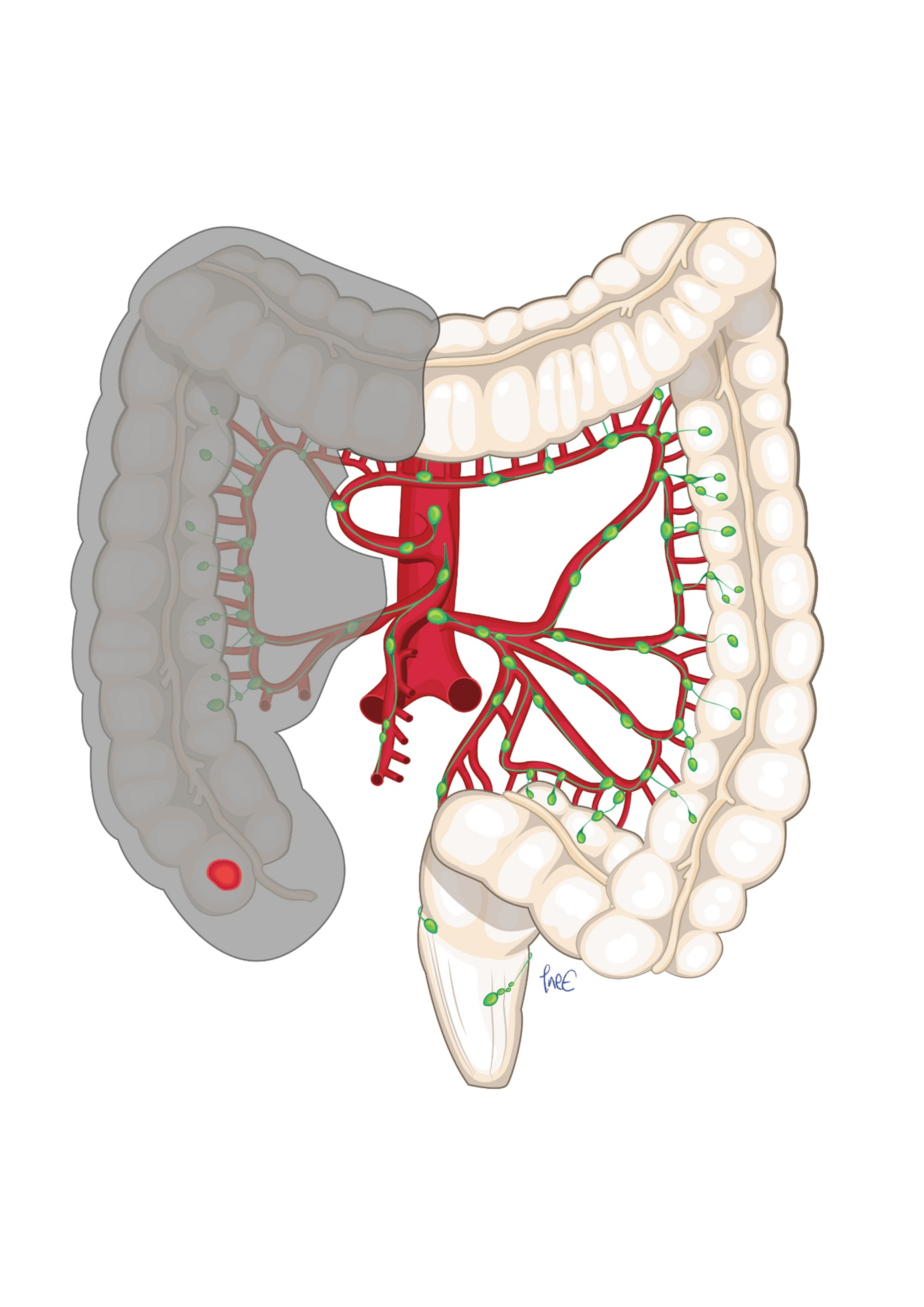 - Kapittel 9: Behandling av tykktarmskreft uten metastaser hvor det fokuseres på preoperativ kartlegging med CT med karrekonstruksjon og lymfeknutedisseksjon ved høyresidig og ved venstresidig tykktarmskreft og med oppdaterte tegninger for de ulike prosedyrene.
