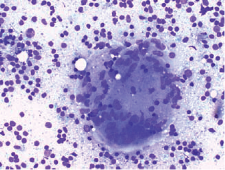 - Langhansk kjempecelle. Det cytologiska bildet gir nesten et 3-D intrykk der ett 50-talls kjerner ses i den syncytiella cytoplasman. (Giemsa; X 40)