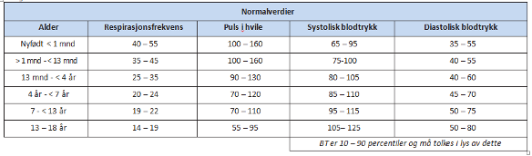 Den norske versjonen, PEVS, er en modifisert versjon av Monaghan [1–6]. I revisjonen desember 2025 inkluderte vi elementer fra Yale observation scale [8] for å tydeliggjøre adferdsbeskrivelsene i PEVS. PEVS brukes ved alle barneavdelinger i Norge. Oversikt over parametere med referanseverdier i de ulike aldersgrupper og skåring av poeng er gjengitt i figur 1. Blodtrykk inngår ikke i PEVS, men 10–90 percentiler for systolisk og diastolisk blodtrykk er tatt med i tabellen med referanseverdier for puls og respirasjonsfrekvens. Vurdering av sirkulasjonen til et sykt barn må baseres på en samlet vurdering av barnets våkenhet og mentale atferd, hudfarge, kapillær fylningstid, puls, blodtrykk og diurese.