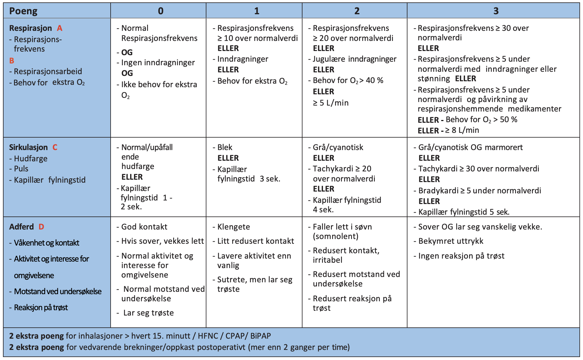 | ≥ 5 | Pasientansvarlig lege og bakvakt skal tilse pasienten umiddelbart. Vurder om anestesi/intensivlege skal kontaktes for vurdering og og ev. overflytting til høyere omsorgsnivå. |